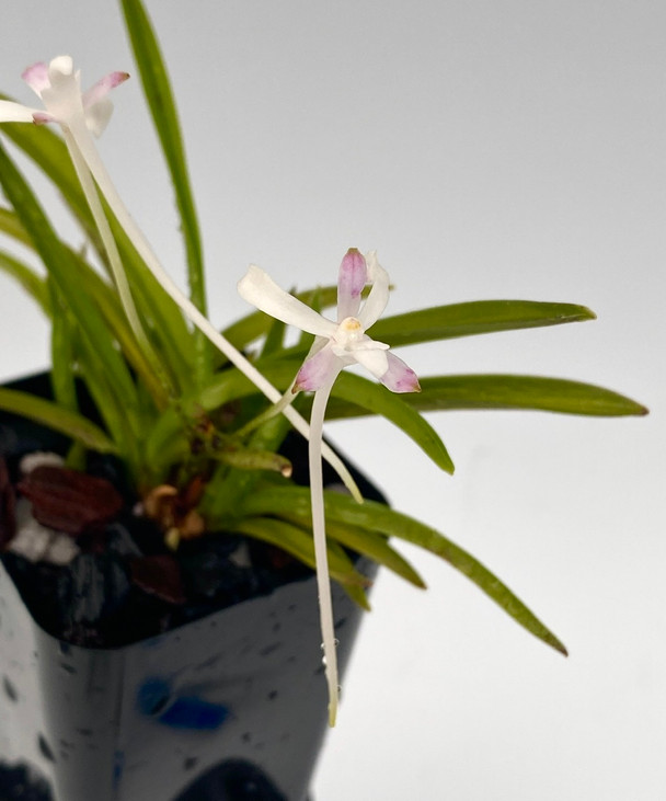 'Kamakiri' translates to praying mantis as the petals of this flower look like they are reaching out to grab something! The petals do not recurve as much as normal Neofinetia flowers, giving them a more wide appearance. In addition, the dorsal sepal and lateral sepals are colored in magenta.