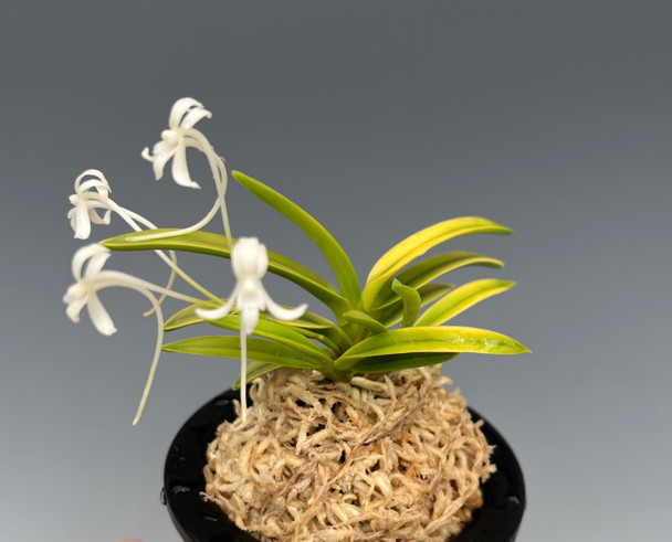 An Orchids Limited made hardy-growing cross between two 'tiger' or 'torafu' variegated foliage type Neofinetia with a golden glow to the foliage. Cooler and brighter conditions will give stronger contrast colors to the foliage, but any condition will keep this variety colorful and robust.