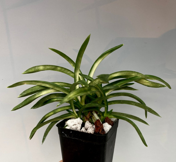 A white tiger spotted Neofinetia whose name means 'Sun Moon Sparkle'. This plant does best in medium to lower light conditions. It is normal for them to get some black blemish on the leaves from time to time.
