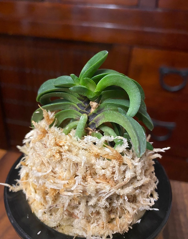 Seikai is a very coveted and classic variety of Neofinetia. These plants have been passed down for generations by hand division since what is thought to be sometime in the 1600's. This variety is sterile, therefore it cannot be reproduced by seed. Seikai can truly be considered a 'living antique'. It has 'Wankyokuba' (curvy leaves), 'Mambeba' (bean leaves) and a 'Namigata Tsuke', which is the wave pattern where the axis meets the leaves. The flowers are also uniquely-shaped and are pinkish in color, and face upwards. If you are a Neo connoisseur, you've got to have a Seikai!