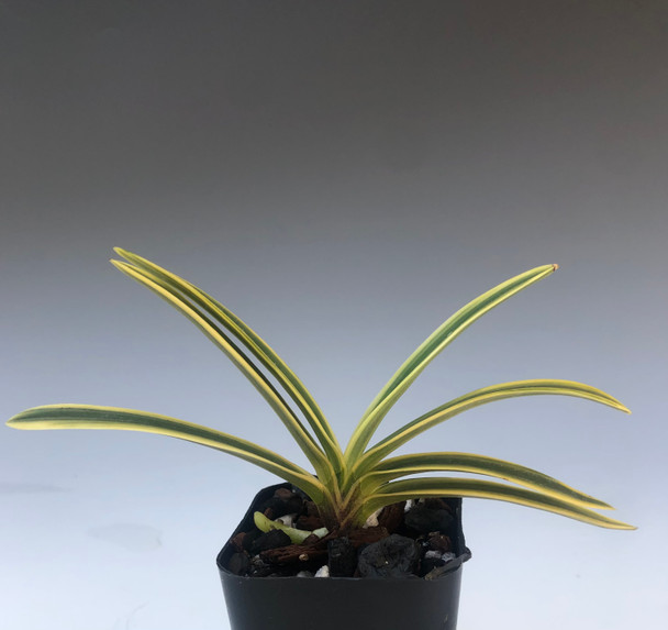 A variety with strong yellow margins. An attractive Neofinetia variety with strongly defined, wide marginal variegation and dark pigmentation at the leaf axes.