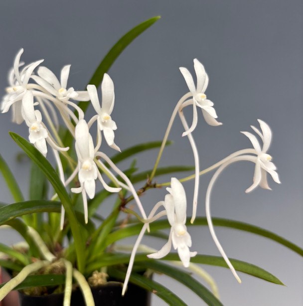 An in-house cross between a variegated Neofinetia and a bean leaf resulted in a mixture of morphology! While there is no variegation that Kogetsu could pass on, those genetics reverted to standard Fuuran-type plants. However, some express the bean leaf genetics from Ryokuhou. A very few of them turned into Kinkujaku.