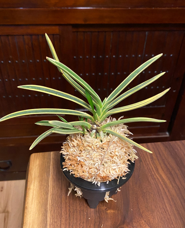 Tenkei Fukurin is known for its bright yellow marginal variegation with straight, stiff and upright leaf structure. Foliage is larger than a standard Neofinetia and flowers are white. Very beautiful color on current offerings.