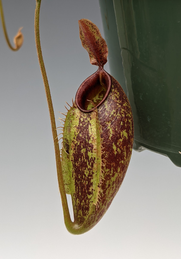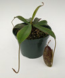 A new cross which has very colorful red and green patterned pitchers with a somewhat sideways peristome opening. Pitchers are approx. 2-3" in length. The leaves have a reddish color to them as well.