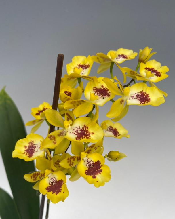 An intergeneric Oncidium hybrid that remains compact with flower spikes that range from 12 to 18 inches in height (on the taller side as they age). They have a very light, refreshing fragrance. These open with a non-resupinate lip (upside down flower), but over time they turn over to normal display.