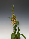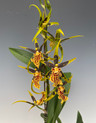 This hybrid has been awarded an HCC/AOS, and has tall and showy spikes. When in bloom, this orchid shows off 5" star-shaped flowers that first open with a greenish color, then progress to being more yellow as the flowers mature. The petals and sepals have chocolate-red markings and the lip is a maze of red vertical striations through the lip. Long-lasting flowers borne on 24" tall spikes with 10 or more flowers. This plant will flower twice per year.