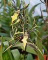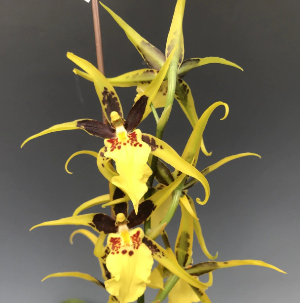 This spider orchid hybrid produces bright yellow spider-shaped flowers featuring a large lip, with some brown spots near the center. Grow in intermediate to warm temps and water as the potting mix approaches dryness.