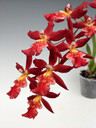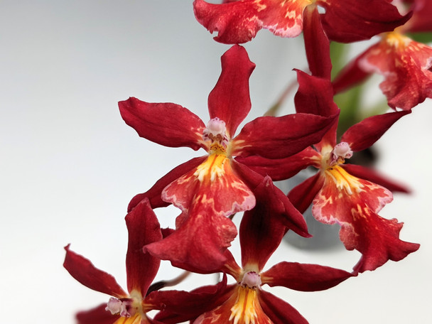 This mericlone hybrid produces sprays of glowing red flowers with a tantalizing white-and-pink lip! As an added bonus, this hybrid is particularly fast-growing and produces high bulb counts in the span of a few years.