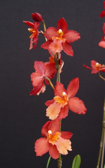 A nice pure red flower accompanied by an orange lip. Mericlones.