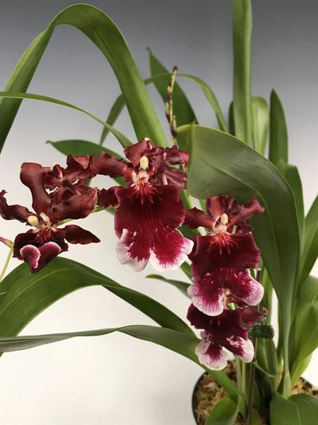 An Odontocidium with a large and velvety lip. The flowers smell like cloves. Current batch have two to three spikes per plant. Very nice!