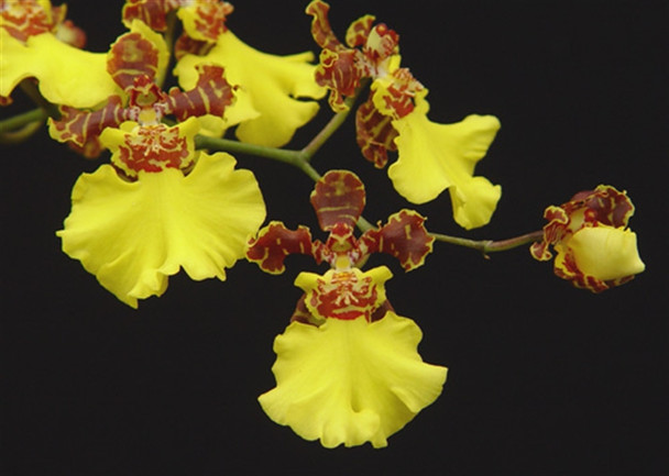 A classical Oncidium flower, often referred to as the 'dancing lady' orchid because of the blouse-like lip. Clusters of bright yellow flowers. Beautiful!