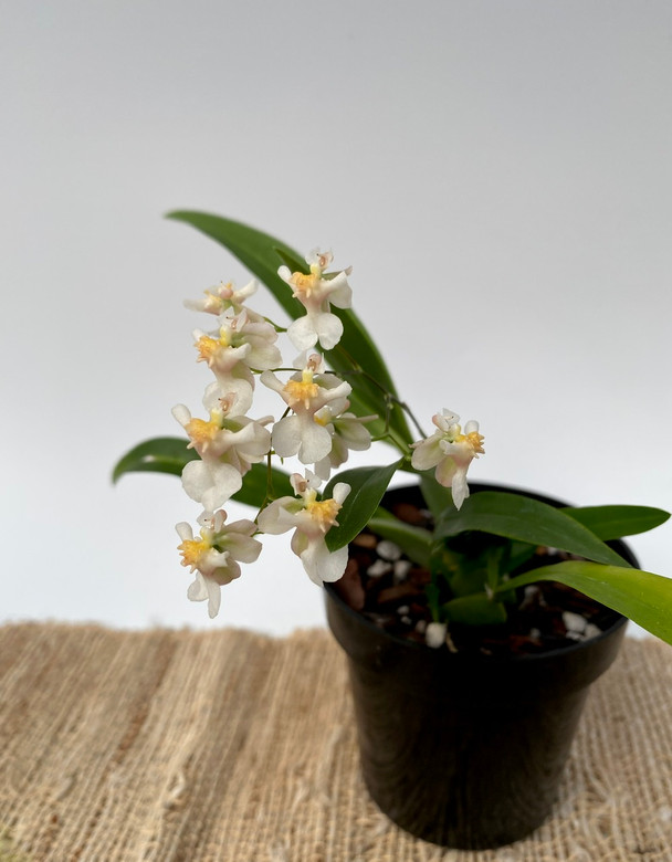 This is a cheerful compact Oncidium that has branching spikes which burst into a cloud of white flowers with a sweet scent. Easy to grow, lots of fragrant flowers and a small foot print is what makes Twinkle such a desirable orchid! This plant likes somewhat lower light like a Phalaenopsis and needs watering just as the mix approaches dryness. These usually flower twice per year in late fall to early winter and then again in the spring.