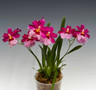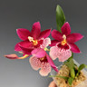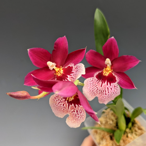 This petite intergeneric hybrid blooms with vibrant 2" wide flowers that have a distinct star shape and an intricately patterned lip. They have a lovely light and sweet fragrance as well. Recently potted up to a 4.5" pot with New Zealand sphagnum moss, this orchid won't need repotting for at least 1 to 2 years.