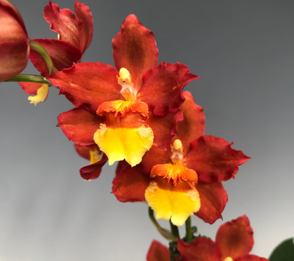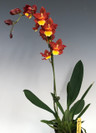 A fantastic intergeneric Oncidium type cross! This orchid has compact Odontoglossum-like pseudobulbs that produce flower spikes in the 16 to 20 inch height range, with 15 to 25 bright, orange 3" flowers with a yellow lip. These can bloom for up to 3 months and can send out spikes twice per year with proper culture.