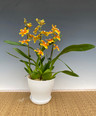 An intergeneric Oncidium hybrid with vivid sunset colors of yellow and orange is a rare color combo for Oncidiinae. Some have reported fragrance on this variety, but we have not detected it. Lush plants are preparing to flower by mid to late June. Please note that this hybrid commonly has yellow and brown spotting on the undersides of the foliage. This seems to be the norm for this hybrid.
