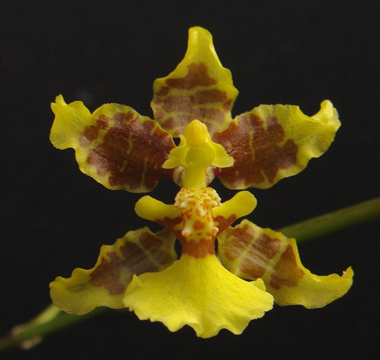 This Oncidium is a medium to large-sized epiphyte from the Lesser Antilles Islands of Martinique, Trinidad and St. Vincent. The graceful branching spikes can reach a length of up to 5 to 6 feet and be covered in hundreds of 1 inch flowers that are yellow with mahogany spotting in the speals and petals. This plant likes medium light and regular household temperatures. We have seen these flower in the spring and fall months.