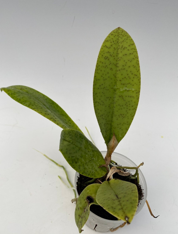 Thick, speckled foliage that grow in well-drained media and do well on slabs. Current plants are just reaching blooming size.