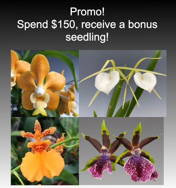 THIS PRODUCT IS PART OF A CURRENT PROMOTION. IT WILL BE AUTOMATICALLY ADDED TO YOUR CART FOR FREE IF YOU SPEND $150 OR MORE. THESE ARE BONUS ORCHID SEEDLINGS, WHICH WILL BE RANDOMLY CHOSEN FOR EACH ORDER MEETING THE PROMOTION CONDITIONS.