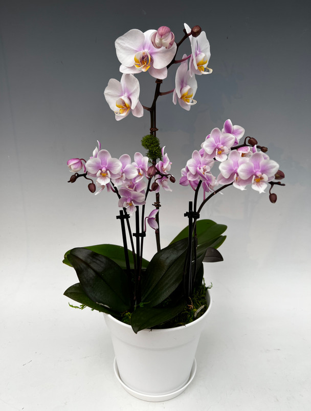 This is a pretty subtle pink and white combination of one mid-sized and two compact Phalaenopsis. The shorter Phalaenopsis have a slight sweet scent to them which is uncommon for standard type Phalaenopsis.