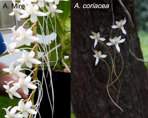 This cross takes the fantastically-blooming A. Mire hybrid and adds in the leathery-leaf genetics of A. coriacea. The result is an intermediately sized hybrid that is expected to produce fragrant, pendulous flower spikes with a high blooming volume!