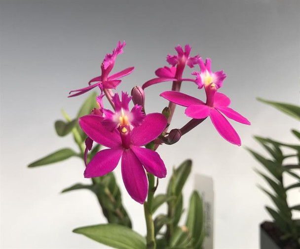 This amazing hybrid maintains its miniature form at 8 inches tall. This orchid can flower twice per year, showing off magenta flowers saturated in color that last for several weeks. Allow the potting mix to just dry between watering. We recommend leaving the flower spikes so long as they are green, as they may branch and re-flower.