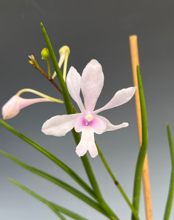 An intergeneric Neofinetia cross with an interesting growth habit, as the Neofinetia has brought down the size but the foliar structure is that of the Papilionanthe. Expect a larger than Neofinetia flower in pink, with a shorter spur, potentially with fragrance. Miss Joaquim is the national flower of Singapore as it grows well and flowers all year round. It is named after Agnes Joaquim (1854-1899) who hybridized Singapore's first orchid. A noble woman indeed!