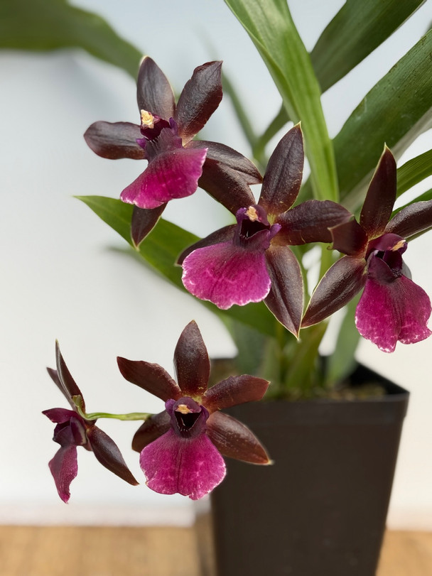 A lovely Zygopetalum hybrid with Promenaea mixed in to make a compact plant and flower. Paired with the deep burgundy color and a light, sweet fragrance, it makes for a lovely novelty orchid!