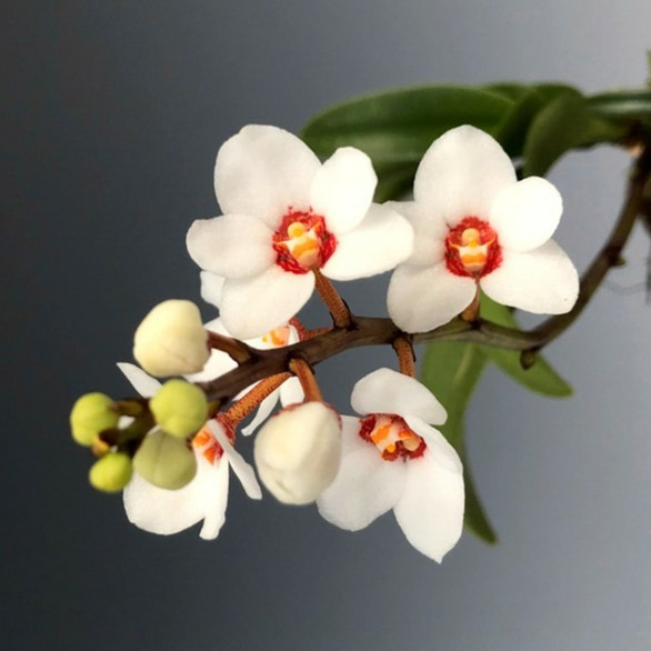 Beautiful miniature hybrid of Australian origin. The smallish plants are tough as nails and can be grown from Phalaenopsis to Cattleya Temperatures. This cross blooms with bright white flowers that have a strong red center. The flowers are long lasting and are sometimes lightly scented!