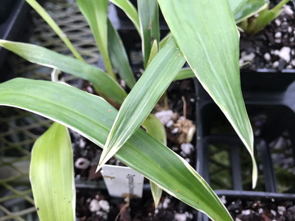 A Zygonisia with variegation on the leaf margins makes for an attractive plant, blooming or not. These plants stay compact, and have cream-colored flowers with a light pink and white lip. Not to be confused with its other clone 'Blue Birds' which has the darker purple/indigo colors.