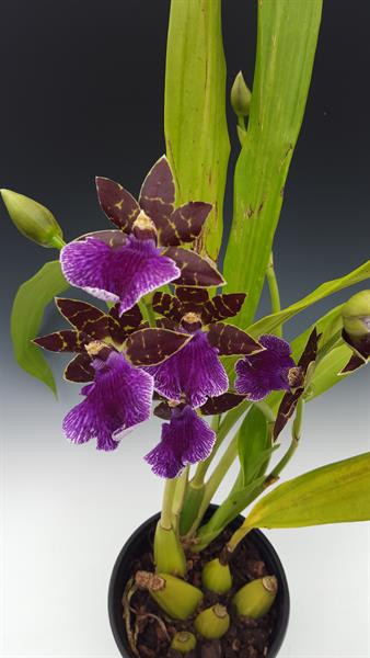 Showy flowers with a sweet fragrance in the morning to afternoon hours. Note that freshly open flowers do not smell or sometimes smell like pepper. After being open for a few days the sweet fragrance will start. Keep them moist at the roots as these are water loving orchids.