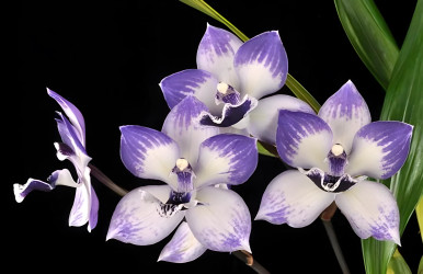A better Zygopetalum cross would be hard to imagine. Both parents have deep chocolate petals and an indigo-blue lip. Super fragrant with a hyacinth scent but sweeter. Likes intermediate conditions and never wants to become dry at the roots. The photo is of the Artur Elle 'Tanzanite' FCC/AOS. The 'Blueberry' clone is very similar in color but with a larger flower. Both plants have a compact habit.