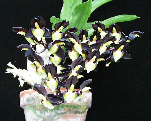 This South America species is a treasure to own! One of the most desirable of the Catasetums, it produces dark brown to black flowers that have a bright, ivory green lip. The 6-12 flowers are around 1.25" in size and produce a spicy fragrance.