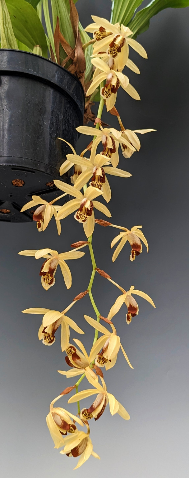 Divisions of an awarded plant! This species produces 2" wide flowers borne on long stems that last 2 to 3 weeks. When in bloom, the fragrance is unique and smells like slightly burnt wood. When this plant becomes a specimen, it will often flower more than once per year with several spikes. Water as the mix becomes lightly damp to the touch.