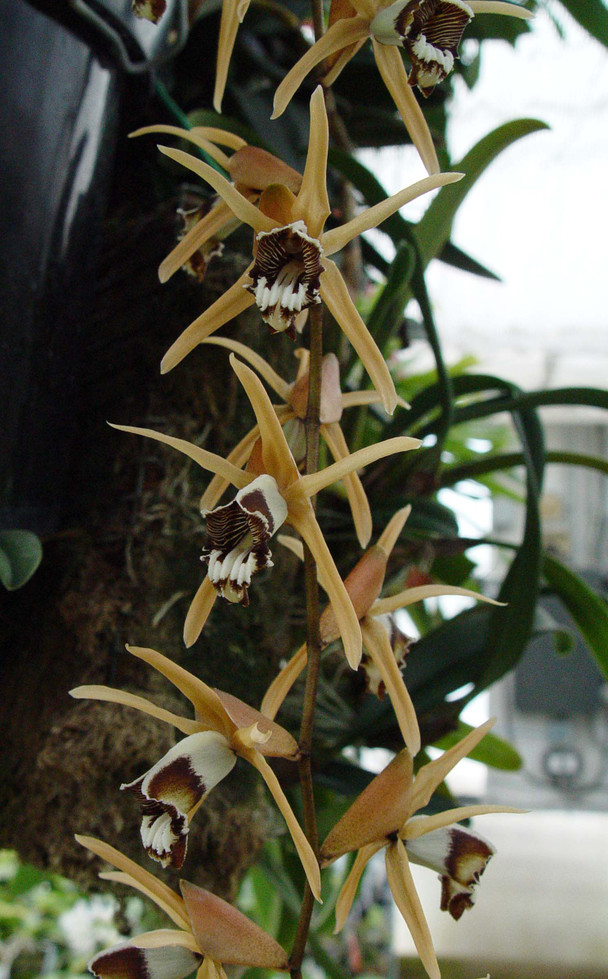 One of our favorite Coelogyne's with long pendulous flower spikes that can be up to 3 feet in length orchid native to Malaysia, Sumatra, Borneo, and Java. Specimen plants. These have incredible pendulous sprays that can be up to 4 feet long, with fragrant white, tan and brown 1 to 2-inch flowers. This species likes Phalaenopsis to Cattleya light and wants to be watered as the potting mix (New Zealand sphagnum Moss approaches dryness. The flowers last about 3 weeks and this plant can flower a couple of times per year. The plants offered are specimen size with several growths.
