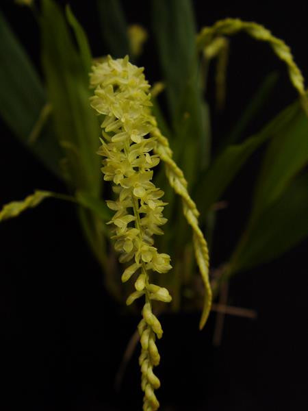 A species from the Philippines that has a similar look to Lily of the Valley. This species bears a cascading, twisting flower spike that has unusual, creamy-salmon colored flowers. There is also a green form, but we are not certain if this has been described as an albino form yet. Fragrant.