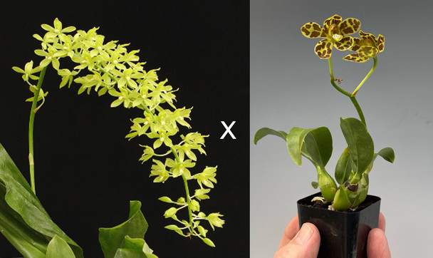 A unique cross between the gigantic citrinum variety and the dwarf type which can flower in a 2" pot! Perhaps something in between the two will be produced and flower while the plants are in 4" to 6" containers. The photo shows the two parents used in the cross, along with the average plant size being offered in 4.5" clear pots.