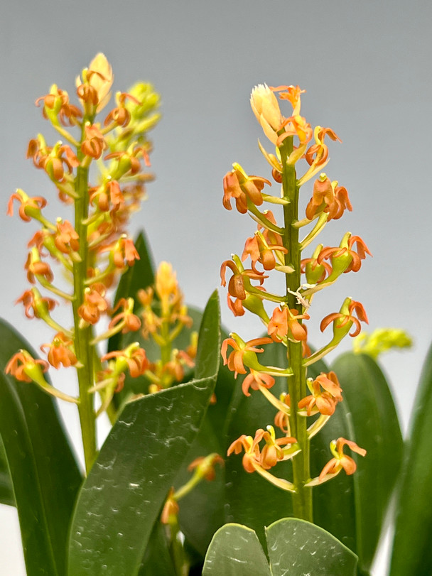 A warm-growing epiphyte found in low-elevation forests from Myanmar to the Philippines. This species has a very short rhizome, so the plump, rounded pseudobulbs are close-set, making for an attractive, compact growth habit. Each spike produces multiple very small orange flowers. Just repotted into fresh New Zealand sphagnum moss, these plants will be happy until the fall of 2024!