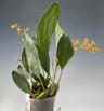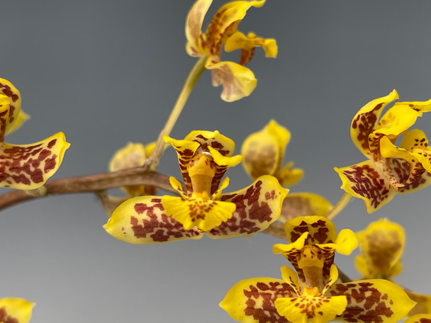 This plant likes medium to bright semi-shaded light and intermediate to warm temperatures. Water as the substrate just dries out. It is normal for this species to have pigment spots on the pseudobulbs and to have a few small black spots in the leaves. Some bulbs will be without leaves . See Photos.