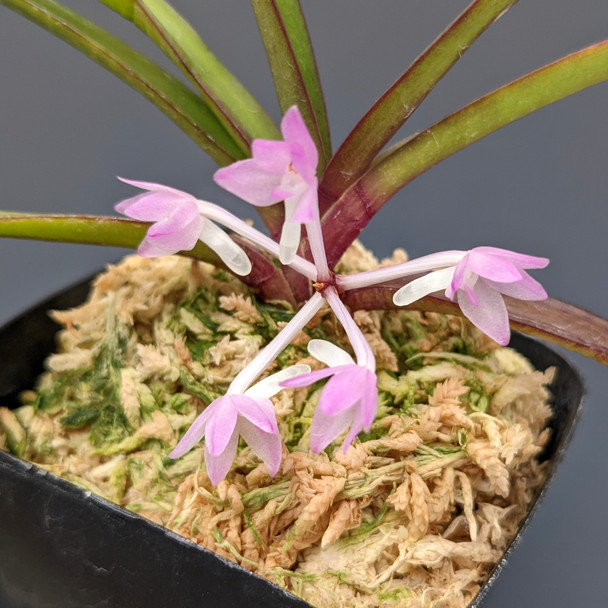 Native to Cambodia, Thailand, and Vietnam, this miniature species grows to be 2" to 4" wide and blooms with white and pink, to light pink, to purple, 1/2" wide flowers. This species enjoys moderately bright to bright light with intermediate to warm temperatures. Allow the moss to approach dryness between watering.