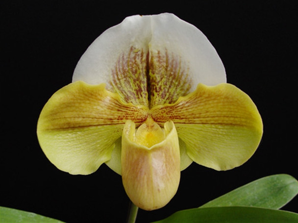 A hybrid made by the Orchid Zone, which has one of the world's best complex Paph. breeding programs. Pictured here is the first plant to flower for us of this cross. Crazy Jolly is known for its very tall spikes and round flowers. Stone Lovely is a large green that is also very consistent in quality.