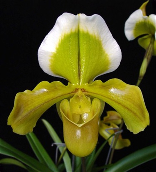 We have a few divisions for sale of the complex green Paph. This clone has a distinct white border on the dorsal.