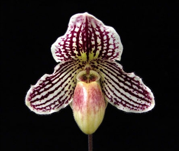 This primary hybrid has nicely shaped flowers that are white to green in color with mahogany to purple spots and markings.