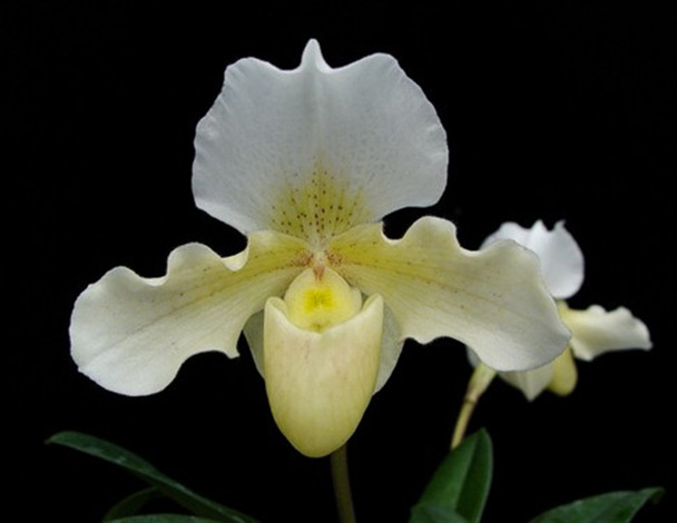 This historical hybrid was registered back in 1932, and was one of the most famous complex white Paphiopedilums in it's early days, and has been a parent or ancestor of over 1100 modern hybrids. We have a few divisons for sale of this awarded clone.