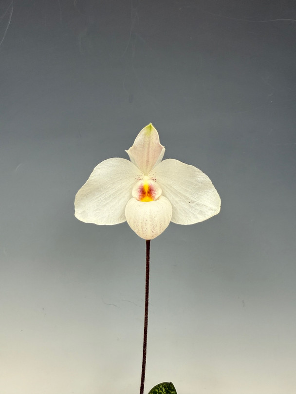 This is a parvisepalum mix of delenatii and Nortio Hasegawa (malipoense x armeniacum), with the delenatii being dormant and creating near-white flowers. Mottled foliage makes for a beautiful plant as well!