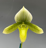 This hybrid has four species ancestors, with a dominant influence by Paph. callosum and Paph. lawrenceanum from the Maudiae parent, as well as an intermediate influence of Paph. superbiens and a minor presence of Paph. sukhakulii genetics. This version of the hybrid was created using all albo-verde (green and white) parents. Even when not in bloom, the foliage is quite beautiful with its mottled green patterns. These plants can flower twice per year and the flowers typically last 2+ months.