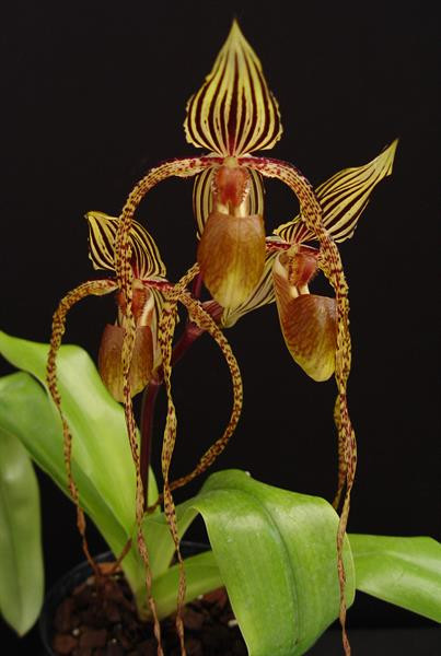 This is a new cross exclusive here at Orchids Limited. Paph. Platy Swith is Paph. platyphyllum x Saint Swithin, This is a very vigorous hybrid with up to 7 flowers per stem! This new hyrbid will be similar to Paph. Angel Hair, but have traits of Paph. Fumimasa Sugiyama.
