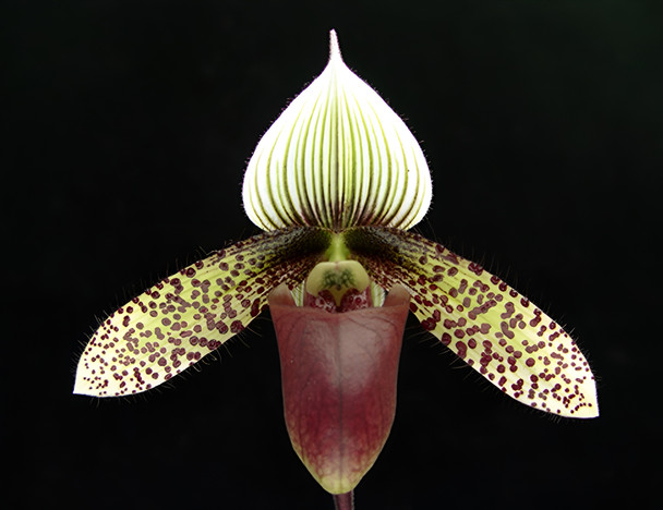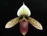 This primary cross has the best of both worlds with beatiful foliage and flowers! Very uniform in flower shape with lovely fine spotting from the suhakulii parents. A fine example of a Southeast Asian lady slipper orchid!