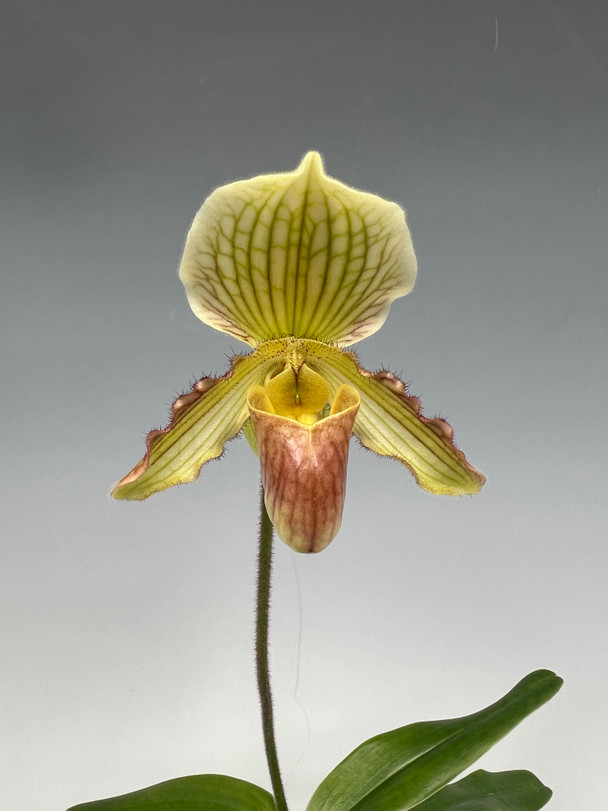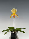 A gold and yellow complex crossed onto a 1/2 albino fairrieanum makes for cute and compact plants, producing multiple growths in a 2.25" pot which is also blooming size! These qualify as a 'tea cup' size Paph.