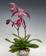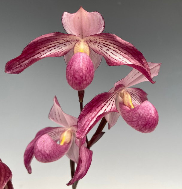 One of the best pink multi-floral x parvi hybrids we've seen, as this orchid always blooms with wonderful color. This cross is made with the vinicolor Paph. delenatii, resulting in particularly dark pigmentation. Even when not in bloom, the mottled foliage makes for a truly beautiful plant. We expect the current plant listed to be blooming size by 2026