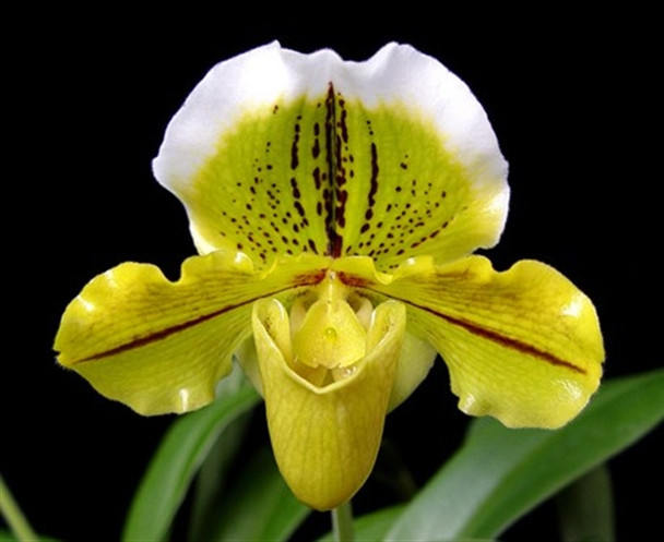 This is a select clone of one of our stud complex Paph's with green and white flowers with a striking mahogany stripe along the petals, and mahogany spots on the dorsal sepal. Only two division are for sale of this stud plant.